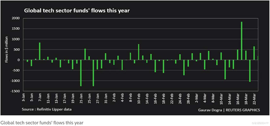 Looking at the numbers, tech funds have seen inflows worth $2.55 billion since March 16 and outflows worth $6.86 billion in the first two months of the year, according to Refinitiv.