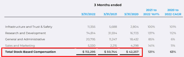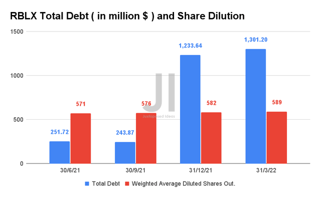 As a result, it is evident that RBLX would need to continue to rely on debt and Share-Based Compensation (SBC) for its operations, given the lack of net income and potentially, reduced FCF profitability moving forward. In the last four quarters alone, the company had increased its total debt leveraged by over fivefold. Furthermore, its SBC expenses in FQ1'22 had also increased by 221% YoY to $112.29M. Assuming a similar rate moving forward, we may expect RBLX to incur up to $450M in SBC expenses for FY2022. As a result, investors who had bought in during IPO may also see their shares diluted for some time to come.