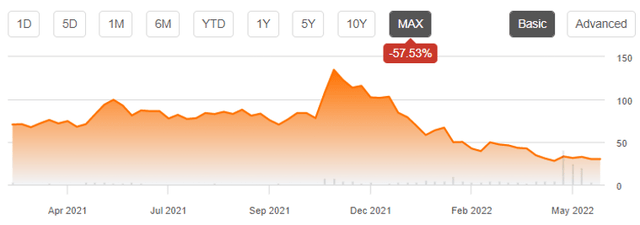 RBLX is currently trading at an EV/NTM Revenue of 5.41x and NTM P/E of -26.45x, lower than its 1Y mean of 13.76x and -60.56x, respectively. The stock is also trading at $29.94 on 31 May 2022, down 78.8% from its 52 weeks high of $141.60 and nearing its 52 weeks low of $21.65.