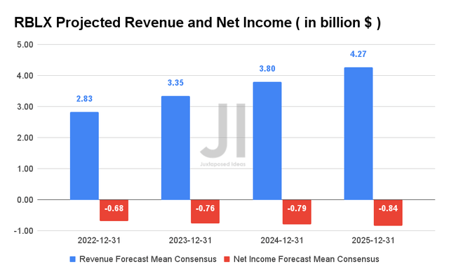 Furthermore, RBLX is expected to report revenues of $2.83B and net income of -$0.68B for FY2022, representing a YoY increase of 48.1% though declining profitability by -31.3%. These numbers are troubling since they also downgraded from our previous February 2021 analysis by -15.2%. As a result, RBLX investors should be concerned about its long-term prospects, given the decelerating bookings and user growth, expanding operational costs, reduced FCF profitability, and increasing SBC expenses.