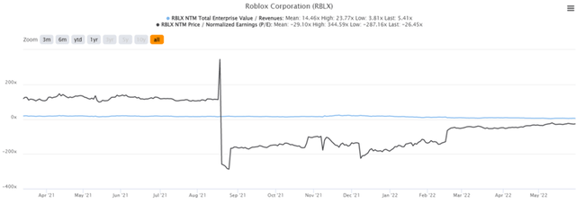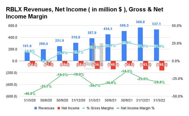 In FQ1'22, RBLX reported revenues of $537.1M, representing a decline of 5.5% QoQ and an increase of 38.7% YoY. Despite the YoY improvement in its gross margin, from 19.6% in FQ1'21 to 21% in FQ1'22, it is apparent that the company is overspending on operational expenses, given that it reported widening net losses of -$160.2M for the quarter. It is also evident that despite RBLX's massive popularity, the company has yet to report profitability with -29.8% of net income margins by FQ1'22.