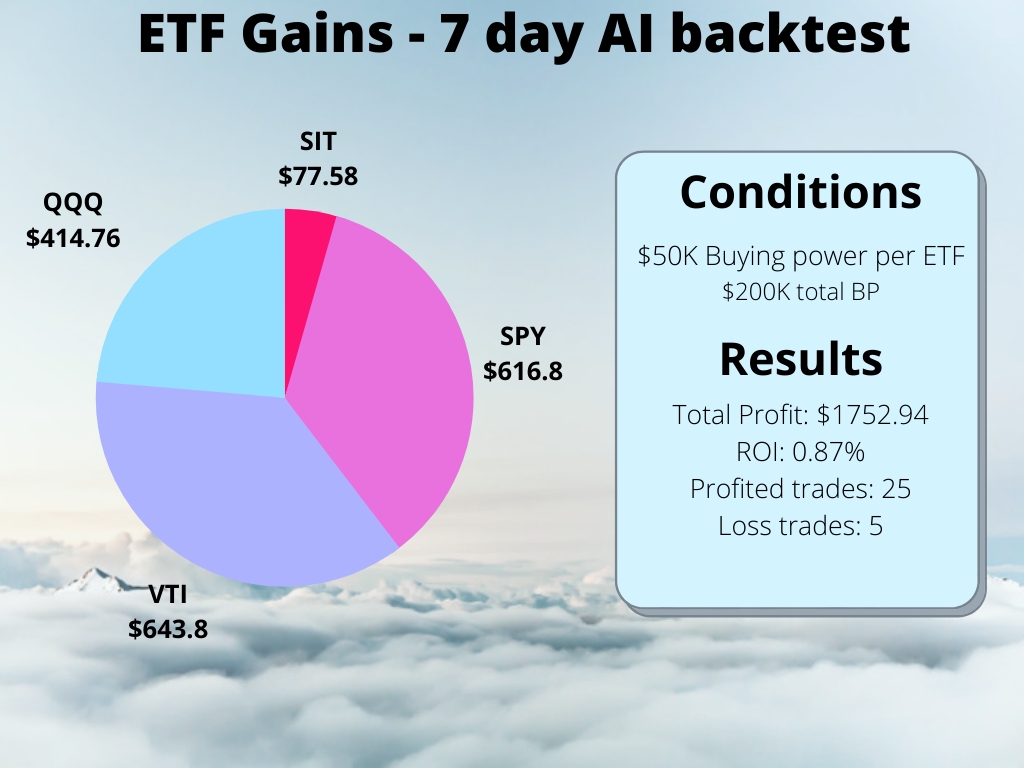 I created a bot that when you enter a stock name, will proceed to backtest that stock using a custom strategy with historical stock data. A few days ago I tried it on TSLA. Today I wanted to backtest a few ETF’s on a 7 day per minute basis. Here are my results.