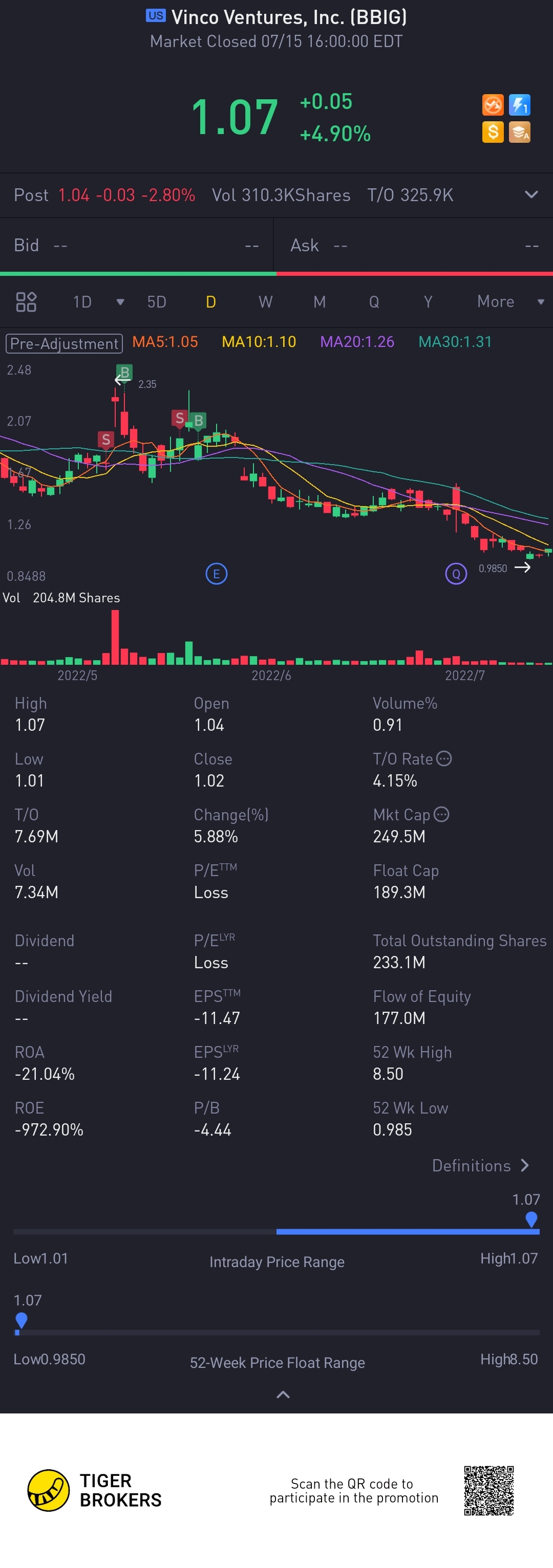 $Vinco Ventures, Inc.(BBIG)$ 5th top winner on my watchlist on last trade day