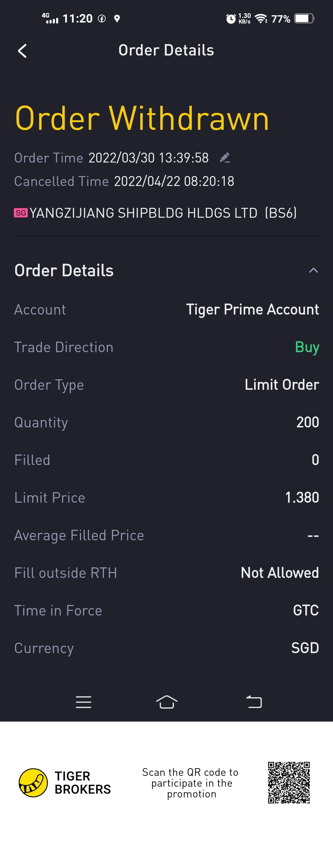 I queued to buy at 1.38 since last month. When price suddenly dropped below $1, my order was withdrawn due to corporate action. I guess triggering of order should be carried out by computer, but the AI is so smart to withdraw my order, to avoid catching the falling knife. Or is it the supervision by human? Anyway, Tiger is the super trading platform.