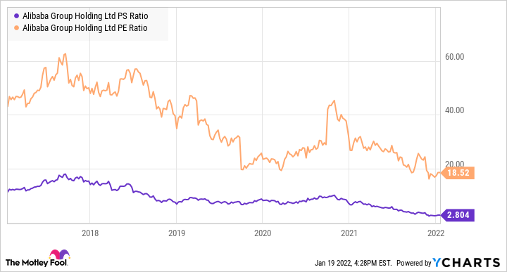 Despite its strong operating metrics, Alibaba's stock price is continuing to slide. It now trades at its lowest price-to-sales (P/S) and price-to-earnings (P/E) ratios since it went public in late 2014. Its ratios are well below Amazon's P/E ratio of 63 and P/S ratio of 3.6, indicating that the market is discounting Alibaba's stock.
