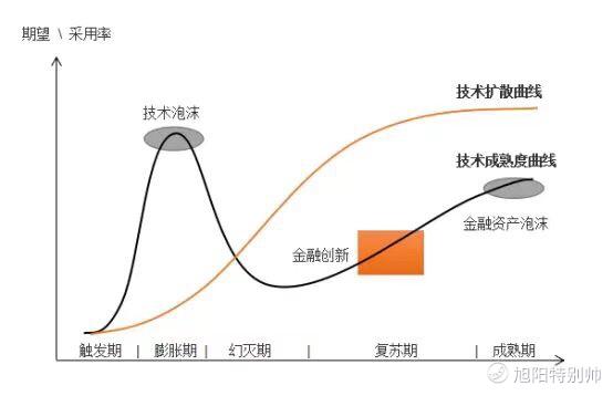 我們繼續深入來看看一項技術革命開始到成熟的發展路線。我們可以聯想近幾年來的共享單車,VR,拉得遠一點的就是本次工業革命-互聯網技信息術。互聯網誕生的時候,很多人瞧不上它,應爲生活中應用場景太少了,還很燒錢。但是總會有吃螃蟹的人,他們紛紛成立.com公司,開辦網站,拉廣告,造成了2000年的互聯網科技巔峯和泡沫。隨後便是破滅,上圖表現得很形象,但是破滅並不意味着全部否定它,互聯網的邏輯是未來。人們總會恐慌過度。這時,技術的發展已經到了最低谷,在前方的是理性的時代。技術開始進入復甦期,成熟的公司諸如阿里巴巴和亞馬遜開始嶄露頭角,期間還衍生出了不少相關金融產品參與到技術助力當中,上市IPO融資等,產業開始迎來黎明,進入黃金時期。