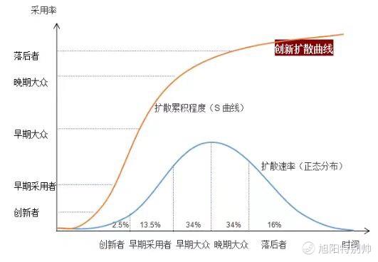 當一樣事物被髮明出來的時候,都有緩慢擴散-加速擴散-到達飽和的擴散過程,但有不少是死在前期(這裏就不再概述)。剛開始這是個新事物,受衆很少,大部分人們認爲這東西不好用或者不符合潮流;但是隨着一傳十十傳百,亦或者技術有了改進,人們逐漸發現還能這樣玩,開始進入加速擴散期;最後便是人們普遍接受甚至是離不開它,擴散速度又會陷入停滯。上圖便是創新擴散曲線。