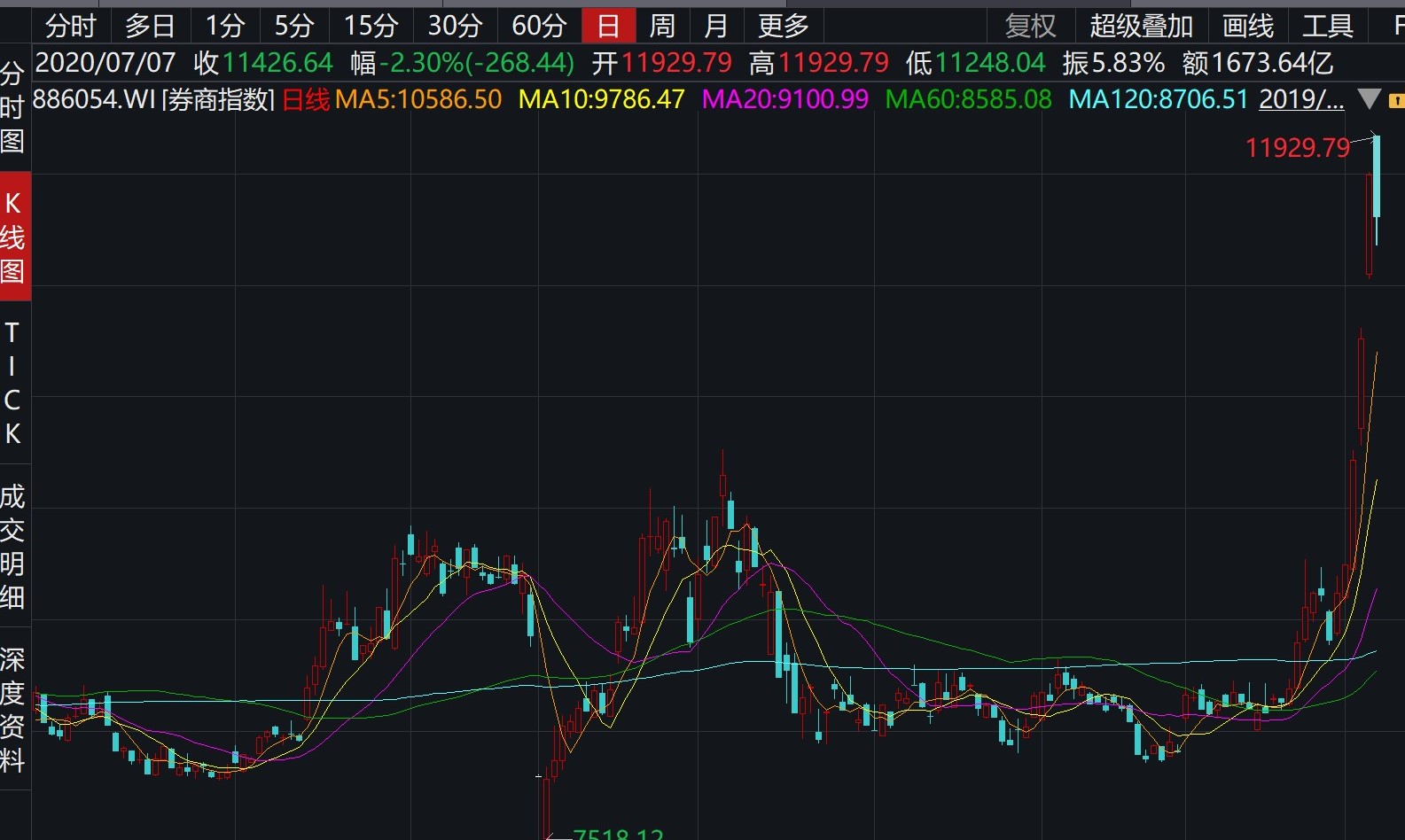 今天7月7日出現回調,券商股突然轉跌。我個人很推薦大家去在A股牛市賺錢,因爲平常你一年掙得錢還不如3個月的牛市賺的錢。這主要是因爲牛市A股一定有央行和政府的支持,這也反映了爲什麼券商銀行保險在牛市鹹魚翻身,他們估值都低,銀行還有很多壞賬平常想漲都漲不起來,券商比銀行好點至少沒壞賬,所以在牛市會漲得兇。你看看工農中建交郵行120萬億市值,這麼大的盤子要是沒政府央行支持資管券商,老百姓不可能把銀行股買漲起來。