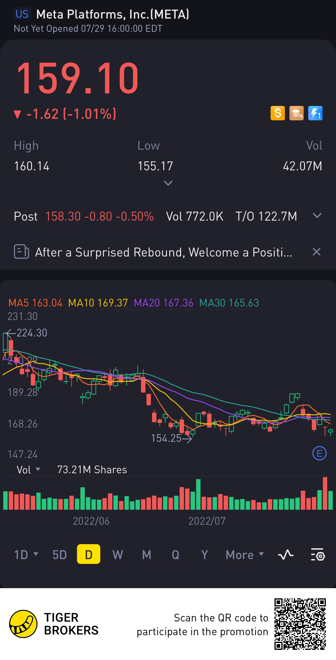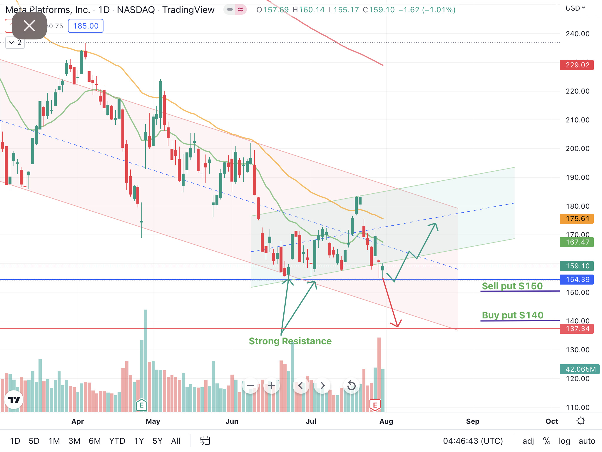 $Meta Platforms, Inc.(META)$planning to do a Bull Put Spread on Meta. Meta closes 159 last Friday. After the recent draw down from weak earnings, its has dip close to the 52weeks low of $154. Looking at 154 being a strong support, expecting prices to hover around or bounce back at this 154/150 level. Thus executing a Bull Put spread - by Selling aput at 150 and Buying a put at $140, expiration 19082022. With a credit of $178, breakeven to look out at 148 if things go south.