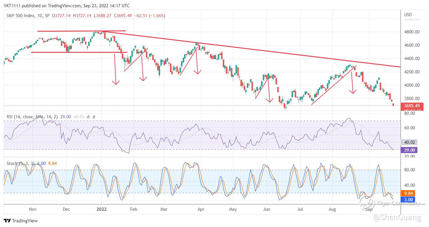 The $SPDR S&P 500 ETF Trust(SPY)$ has lost more than 20% since the onset of the year, consistently forming lower lows and lower highs since peaking on January 5, 2022 and is currently trading at its lowest level in two years. The SPY's index - the S&P 500 - was hard hit since August 17, 2022, as recession fears are rising. The selling pressure intensified over the past week as outlook remains bleak and investors are bracing for the worst earnings season in two years. Trillions of dollars have been ripped off the value of the stock market and all three major U.S. indices have fallen more than 20% since the onset of the year and the current state of play suggests the market has further to fall before hitting a bottom.