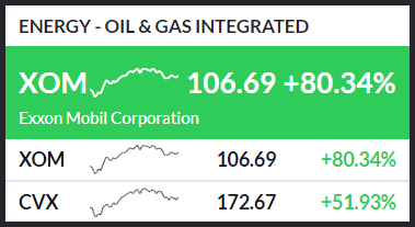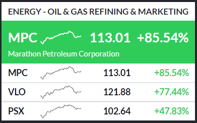 Oil & Gas Integrated stars: $Exxon Mobil(XOM)$ , $Chevron(CVX)$ Oil & Gas Refining & Marketing stars: $Marathon(MPC)$, $Valero(VLO)$, $Phillips 66(PSX)$
