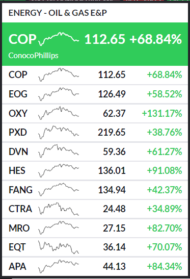 Oil & Gas E&P Stars: $ConocoPhillips(COP)$, $EOG Resources(EOG)$, $Occidental(OXY)$, $Pioneer Natural Resources(PXD)$, $Devon(DVN)$, $Hess(HES)$, $Diamondback(FANG)$ ,$Coterra Energy Inc.(CTRA)$ , $Marathon(MRO)$ , $EQT Corp(EQT)$ , $APA Corporation(APA)$.