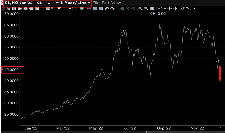 First, due to the increasing inventory, the price of ultra-low sulfur diesel (HO) still has room to fall, that is to say, the cracking price difference of ultra-low sulfur diesel still has room to narrow. Please see the following figure. The decline in diesel prices will more or less give downward pressure or temporary upward resistance to crude oil prices.