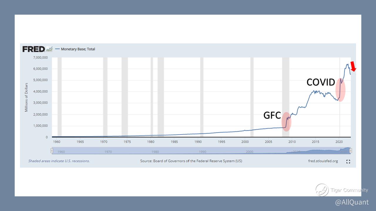 In case anyone has any doubt that we are currently in a credit-tightening cycle, just take a look at the total US monetary base over time. The monetary base was growing nicely at a pretty constant rate before the Great Financial Crisis in 2008. Then with Ben Bernanke at the helm of the Fed, the self-proclaimed student of the Great Depression unleashed a bold experiment upon financial markets. As a result, the monetary base jumped and expanded multiple times over the last decade. There was an attempt to reduce the monetary base but when COVID-19 struck, what took months of tightening was quickly reversed and then some. Of course, this led us to where we are today, with inflation not seen for the past 40 years.