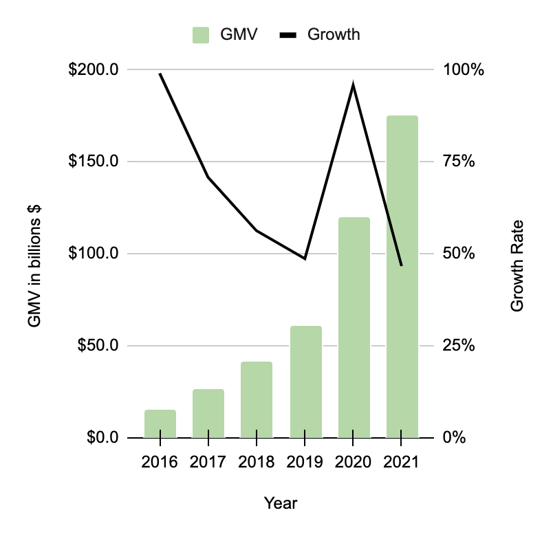 GMV growth has slowed down substantially since the fourth quarter of 2021. 1Q22 GMV was $43.2 billion which was only 16% above what we saw in 1Q21 and 2Q22 GMV was $46.9 billion which was only 11% above what we saw in 2Q21. Much of this slowdown is because of the pull-forward we saw from covid in 2020 and 2021. The 2022 GMV growth rate might end up being single digits but I am optimistic that it will go back to healthy double digits in 2023 - maybe between 20 and 30%.