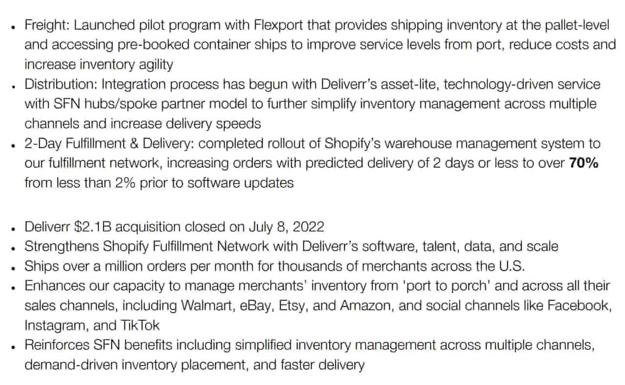 In the 2Q22 call, Shopify President Finkelstein explains that the last step in logistics is 2-day fulfillment and delivery. It is the most critical step and in the past it has been hard for merchants to get this right on their own. The numbers show that conversions increase when merchants can promise a delivery window - even if it is up to 3 or 4 days: