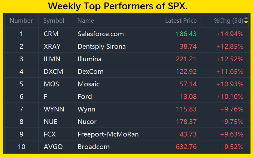 The top 10 winners of$S&P 500(.SPX)$ are $Salesforce.com(CRM)$, $Dentsply Sirona(XRAY)$, $Illumina(ILMN)$ , $DexCom(DXCM)$ ,$Mosaic(MOS)$ ,$Ford(F)$ ,$Wynn(WYNN)$ ,$Nucor(NUE)$ ,$Freeport-McMoRan(FCX)$ ,$Broadcom(AVGO)$