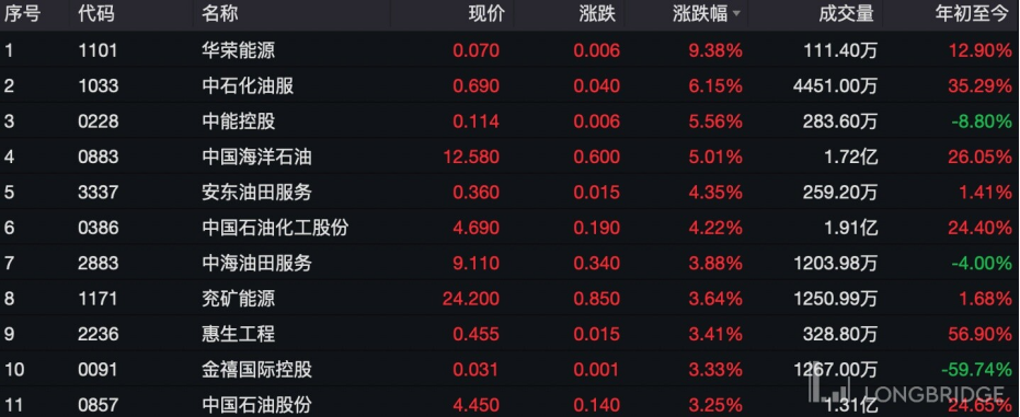 3月7日週二,港股高開高走,早間一度漲近 2%。盤面上看,“中字頭” 股票集體走強,領漲大盤。其中,中石化油服漲超 6%,中能控股、中國海洋石油漲超 5%,中國石油化工股份漲 4%,中國神華、中國石油股份漲超 3%。