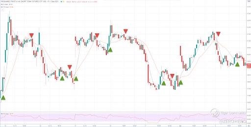 For this strategy, weโll use two moving averages. The faster MA has a 5-period setting, and the slower MA a 15-period setting. The following chart shows how the VIX index chart looks like with the MAs applied to it. Again, the green arrows signal possible buy setups, while the red arrows signal possible sell setups.