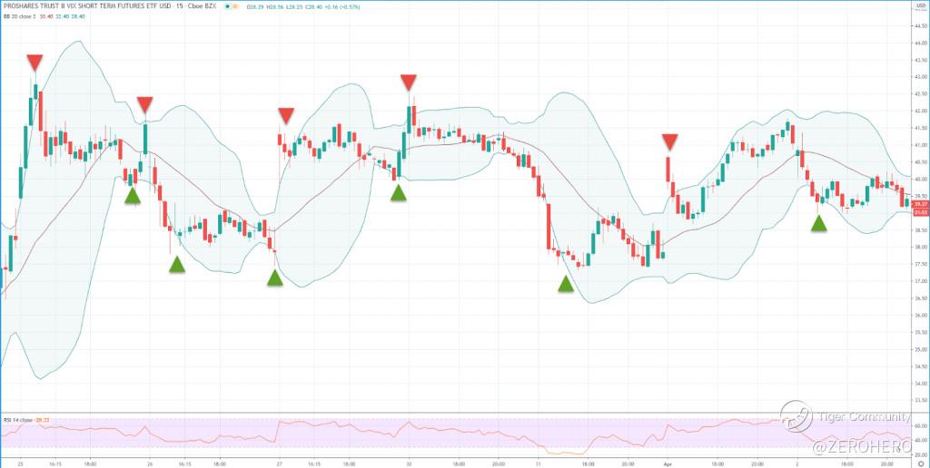 The following chart shows the VIX short-term futures ETF with Bollinger Bands applied to it. The green arrows indicate possible buy signals, and the red arrows possible sell signals.