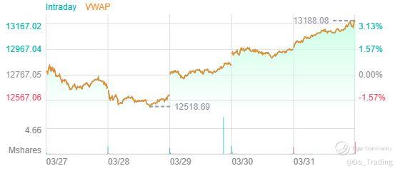 $DJIA(.DJI)$ increased by 1.3% on the day and 3.2% over the week. It was the biggest DOW week's winning since the week ending on November 11. He finished the quarter up 0.4%.