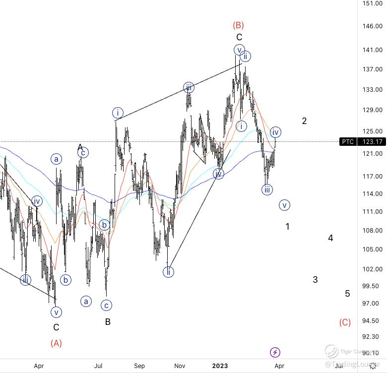 PTC Elliott Wave Count:  Wave {iv} of 1.