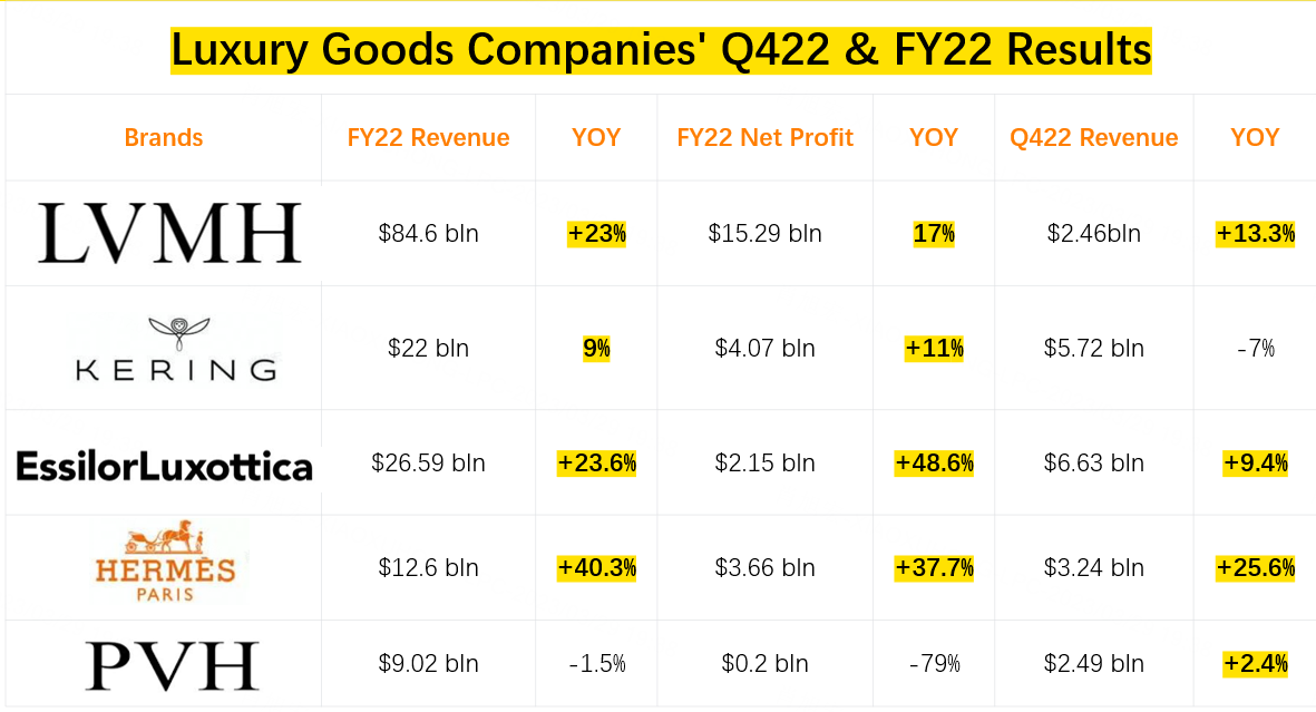 In this article, we collected the top 17 luxury goods companies Q422 or FY22 financial data, knowing that 12 of 17 companies see sales increased YoY and, most of the 17 companies see net profit increased YoY as well.