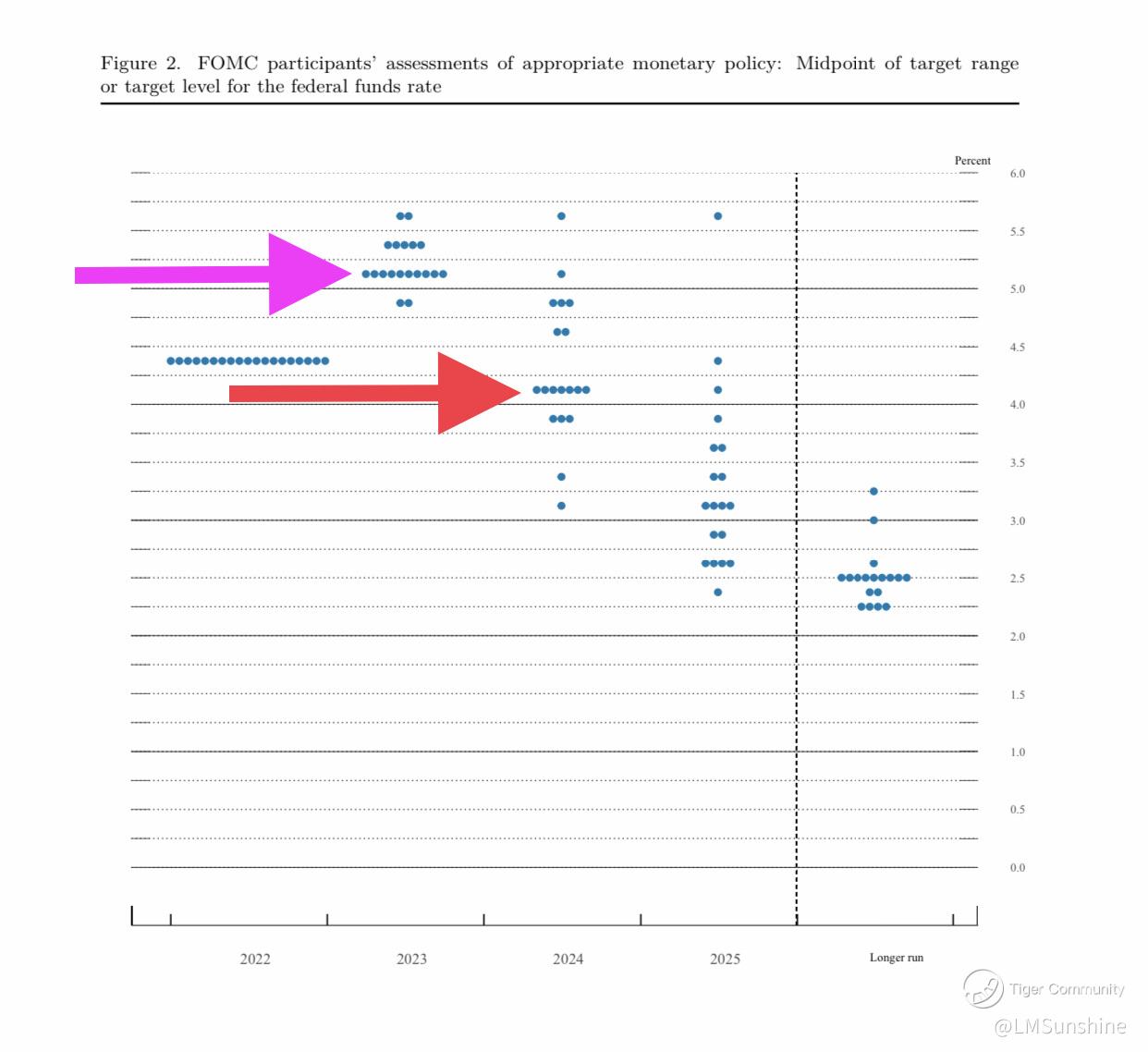 ⭐️ Each dot represents the middle of a range. For example, in the 2022 column, the dots plotted at 4.375% actually represent the range 4.25% to 4.75%.