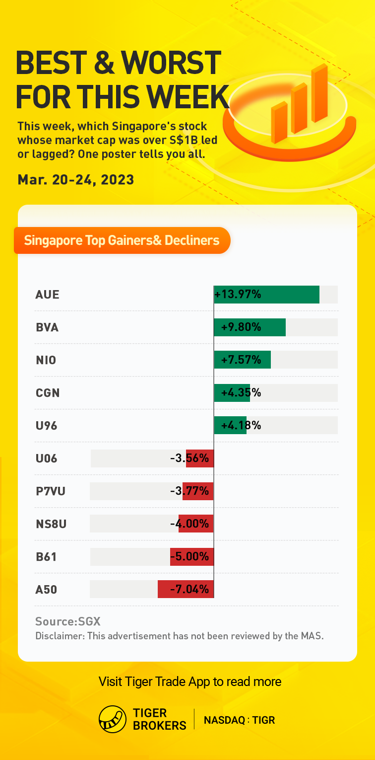 During the last 5 trading days, $GOLDEN ENERGY AND RESOURCESLTD(AUE.SI)$, $TOP GLOVE CORPORATION BHD(BVA.SI)$, $NIO Inc.(NIO.SI)$, $BEST WORLD INTERNATIONAL LTD(CGN.SI)$ and $SEMBCORP INDUSTRIES LTD(U96.SI)$ are the top 5 Weekly gainers, up 13.97%, 9.80%, 7.57%, 4.35% and 4.18% respectively.