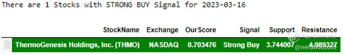 Model predicted STRONG BUY signal for $ThermoGenesis Holdings, Inc.(THMO)$ on 16 Mar 23.