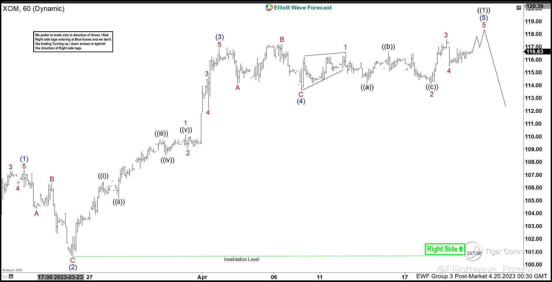 Exxon Mobil (XOM) cycle from 3.20.2023 low is in progress as a 5 waves impulse Elliott Wave structure. Up from 3.20.2023 low, wave (1) ended at 107.35 and pullback in wave 2 ended at 100.68 as the 1 hour chart below shows. Up from there, wave 1 ended at 110.17 and wave 2 ended at 109.05. Wave 3 ended at 114.64, wave 4 ended at 112.20. Final wave 5 ended at 116.85 which completed wave (3) in higher degree.