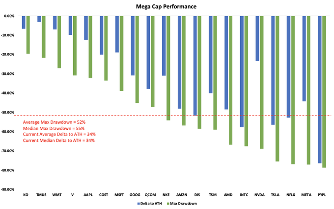 Mega-cap stocks:4/20 were down over 75%, while 11/20 were down over 50%
