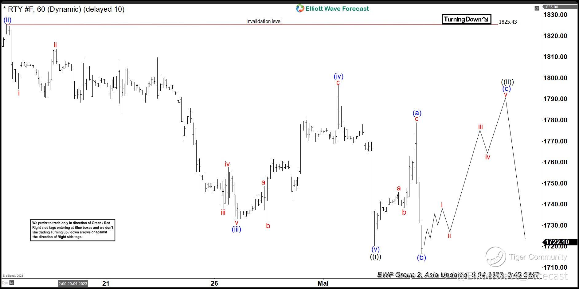 Russell 2000 (RTY) Cycle from 4.3.2023 high is in progress as a 5 waves diagonal. Down from 4.3.2023 high, wave (i) ended at 1752.7 and rally in wave (ii) ended at 1825.43. The 1 hour chart below shows the chart starting from wave (ii) peak. The Index then resumes lower in wave (iii) towards 1731.7. Internal subdivision of wave (iii) unfolded as a 5 waves impulse. Down from wave (ii), wave i ended at 1794.8 and rally in wave ii ended at 1814. Index resumes lower again in wave iii towards 1733, wave iv rally ended at 1748.80. Final leg wave v ended at 1731.7 which completed wave (iii).