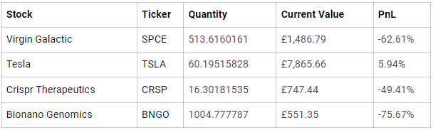The shares I currently own are all highly speculative growth stocks. You may disagree or agree with my picks and I am open to hearing your thoughts down in the comments below. I am now in my 4th year investing which in the grand scheme of things is a short time so I am open to the fact that my opinions may be flawed and I am happy to be proven wrong, however with my current judgement I am happy with my picks. $Virgin Galactic(SPCE)$ $Tesla Motors(TSLA)$ $CRISPR Therapeutics AG(CRSP)$ $Bionano Genomics(BNGO)$
