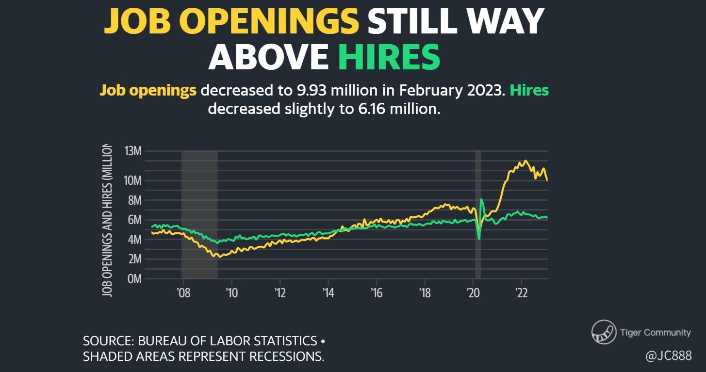 For Feb, there were 9.9 million jobs open vs 10.6 million (Jan 2023) and 11.6 million (Feb 2022).