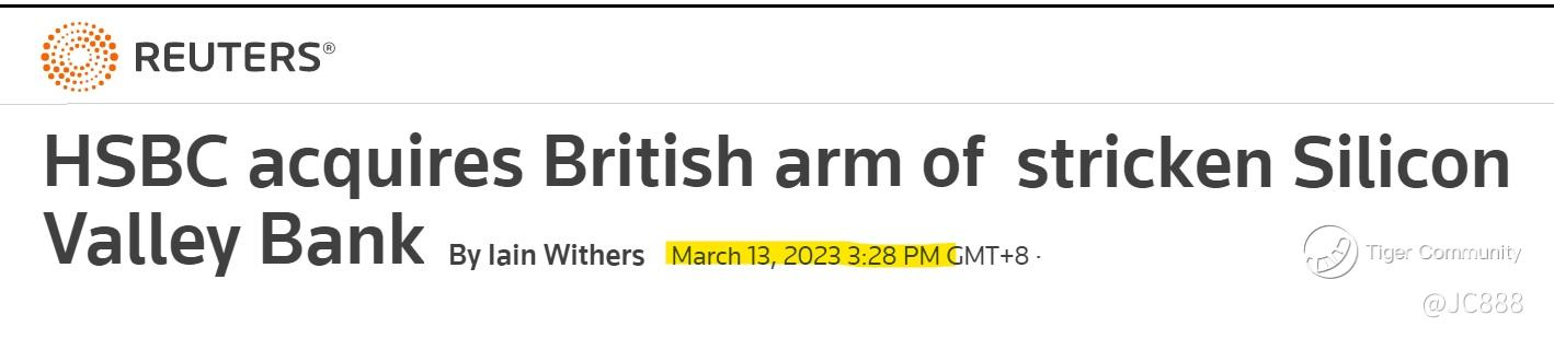 $HSBC Holdings PLC(HSBC)$ announced on Mon (13 Mar 2023), its acquiring UK subsidiary of stricken SVB for 1 British pound; rescuing a key lender for technology start-ups in Britain.
