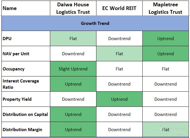 Below is the comparison for logistics-focused REITs based on the latest result, extracted from comparison tables on SREITs Data page: