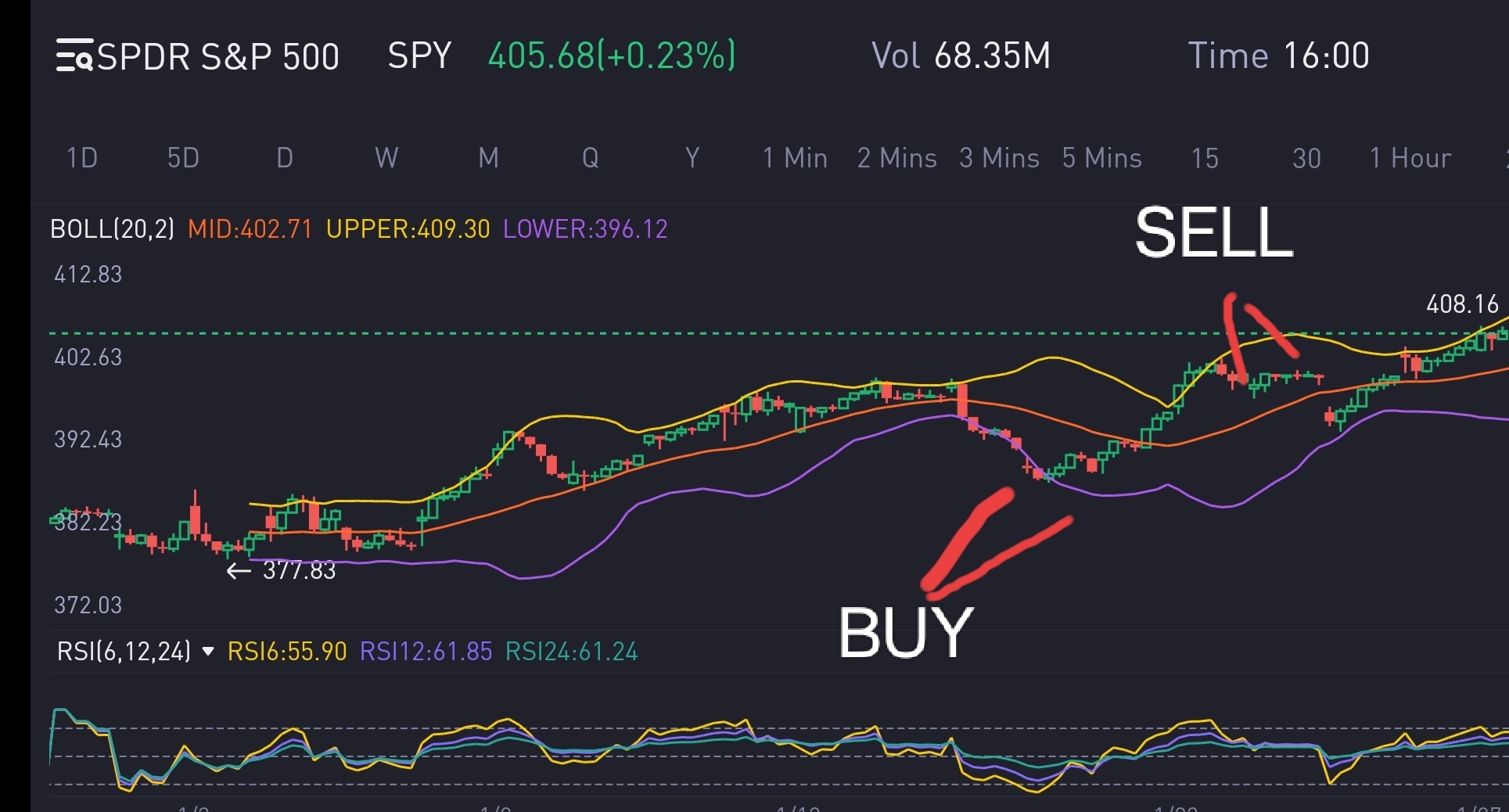 It's is also good to bear in mind prices can stay in the lower or higher bands for indefinite amount of time.