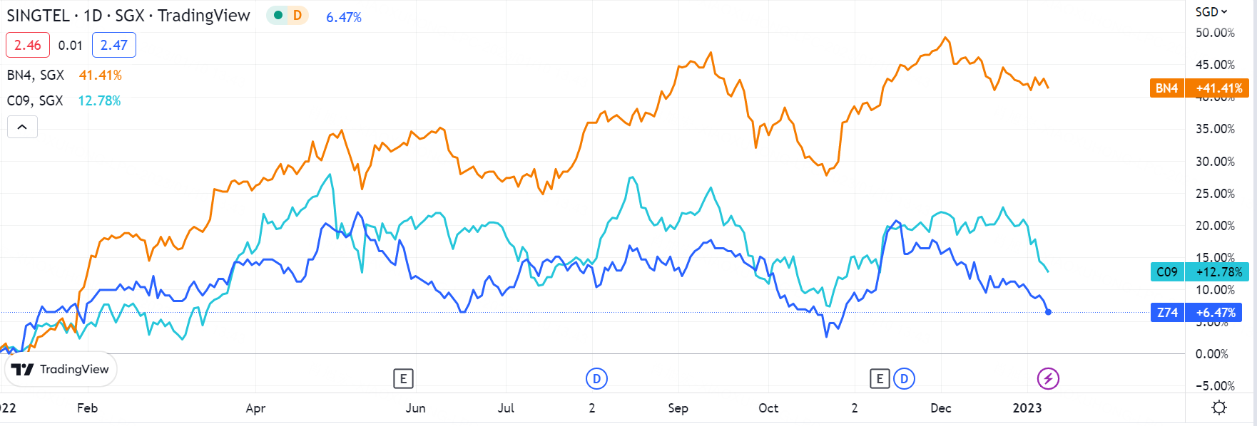 All four of three of these stocks have been among the group of stocks that have been pursuing strategic initiatives to add shareholder value, which has involved acquisitions, disposals, restructuring or pivots to new revenue streams. Singtel's 1HFY23 (end 30 Sep) net profit came to S$1.2 billion which was boosted by the S$1 billion net exceptional gain from the group's partial divestment of its stake in Airtel. This had followed the Group's divestment of its 70% equity stake in Australia Tower Network which boosted its top line for FY22 (ended 31 Mar).