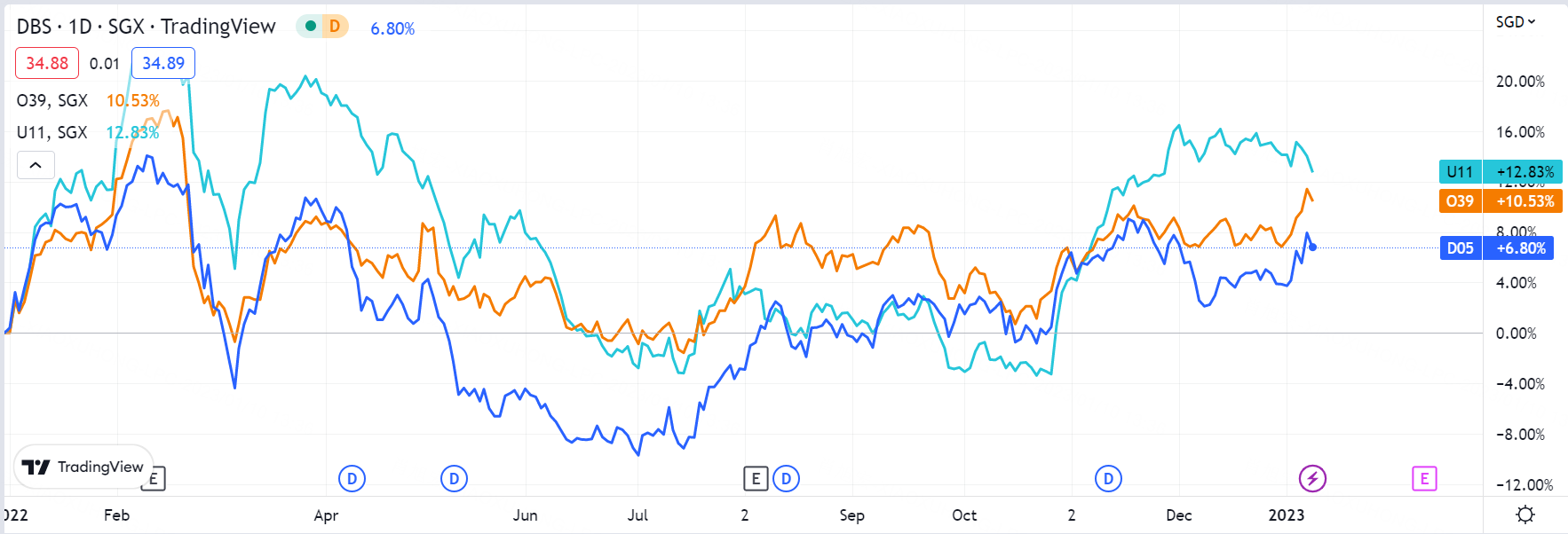 For the 2022 year, the trio of $DBS GROUP HOLDINGS LTD(D05.SI)$ , $OVERSEA-CHINESE BANKING CORP(O39.SI)$ and $UNITED OVERSEAS BANK LIMITED(U11.SI)$ ended 2022 with a 46.9% weight in the STI. The trio averaged 13% total returns over the year.