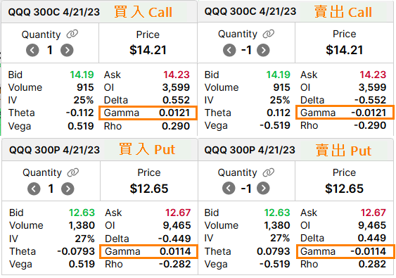 因為這個值是Delta的一階導數(所以可以看成股價變化的二階導數),因為導數的計算,所以它在買方一律為正值,而賣方就是負值。