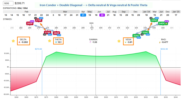 - Vega屬性相反的兩組策略還能互相掩護,變成Vega中性策略 (Vega Neutral),例如 Iron Condor + Double Diagonal。