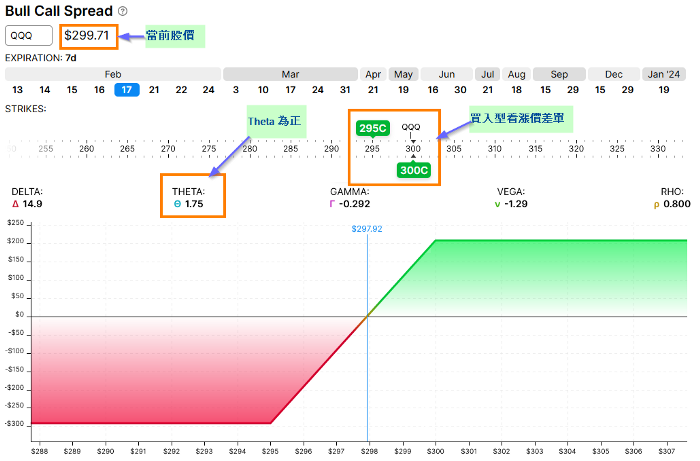 別以為複合型買入型策略就一定是負的Theta,當價內合約出現在策略中的時候,Theta就有機會變成正值,從[時間損耗]變成[時間加值]!例如下面的買入行價差單就是這種情形之一。