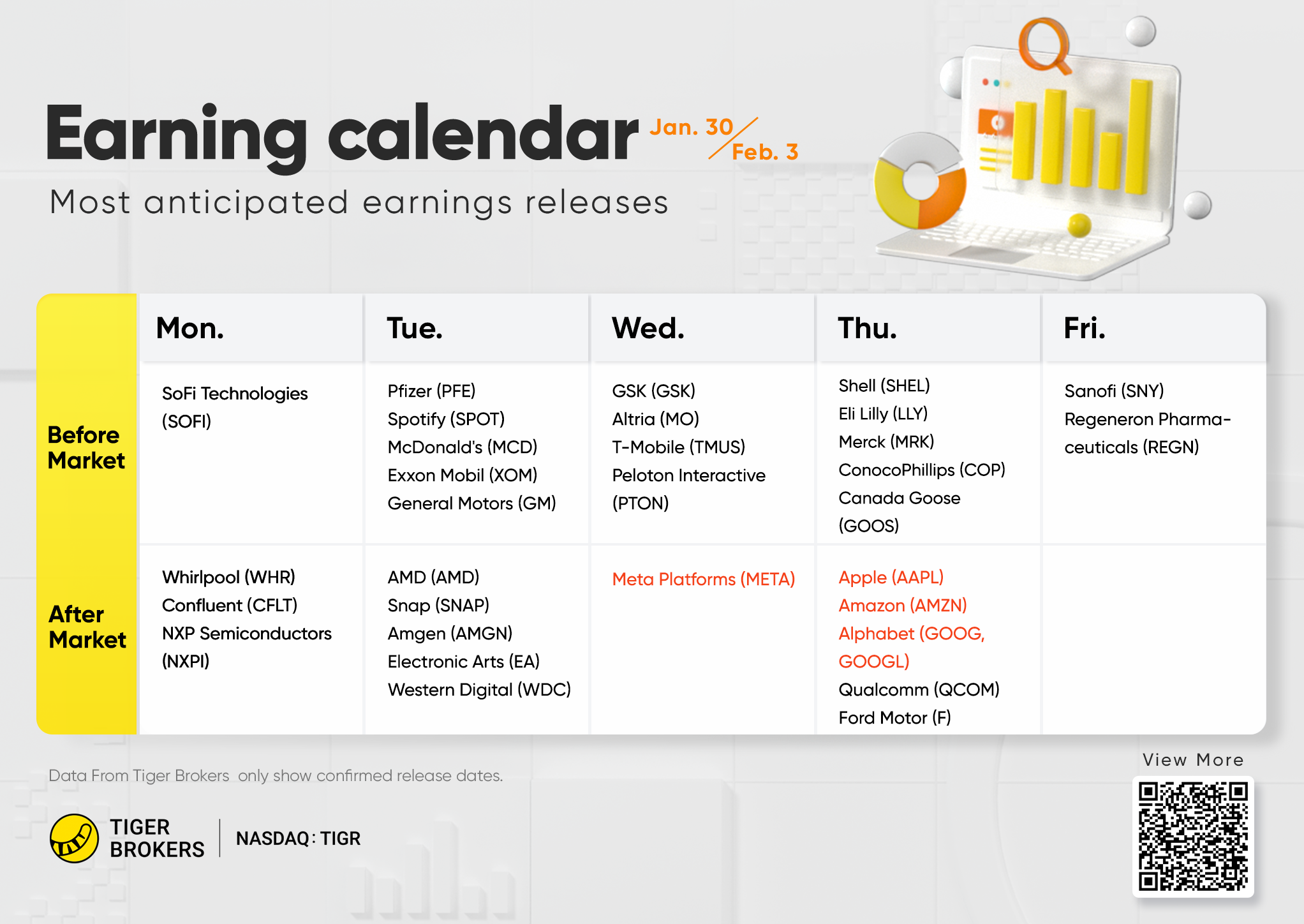 The busiest week of the earnings season is coming up, with roughly 20% S&P 500 companies will report earnings this week, including $McDonald's(MCD)$,$Advanced Micro Devices(AMD)$ and $General Motors(GM)$ on Tuesday followed by tech giants $Apple(AAPL)$ , $Meta Platforms, Inc.(META)$ , $Amazon.com(AMZN)$ and $Alphabet(GOOG)$ later in the week.The Federal Open Market Committee meets on Tuesday and Wednesday, when the Fed is expected to hike rates by one-quarter of a percentage point. Investors will be looking for clues about how much higher the central bank will take rates in the fight against inflation. Will the S&P 500's most influential companies reverse the downward trend?. Let's see what just happened.