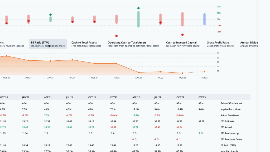 During that time, the post-earnings move was outside of the implied range 7 times. In those cases, long straddles were profitable. The rest of the earnings moves likely yielded profitable short straddles. We can overlay quarterly financial data by clicking on the ratios below the earn move graph. Let’s look at the PE ratio, which is the stock price divided by the trailing twelve months earnings per share.