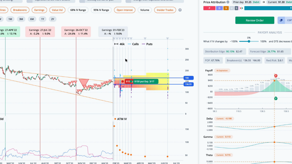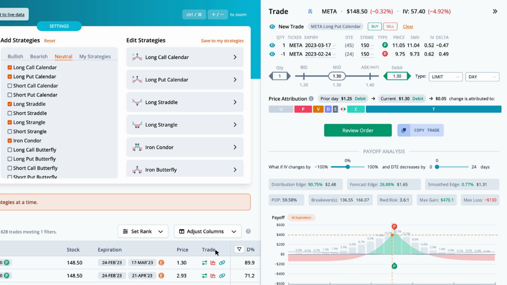 This helps narrow the results to trades that are fairly priced. The highest ranked trade is a LongPutCalendar with strikes at 150, expiring on Friday, February 24th and Friday, March 17th, for a debit of $1.3.