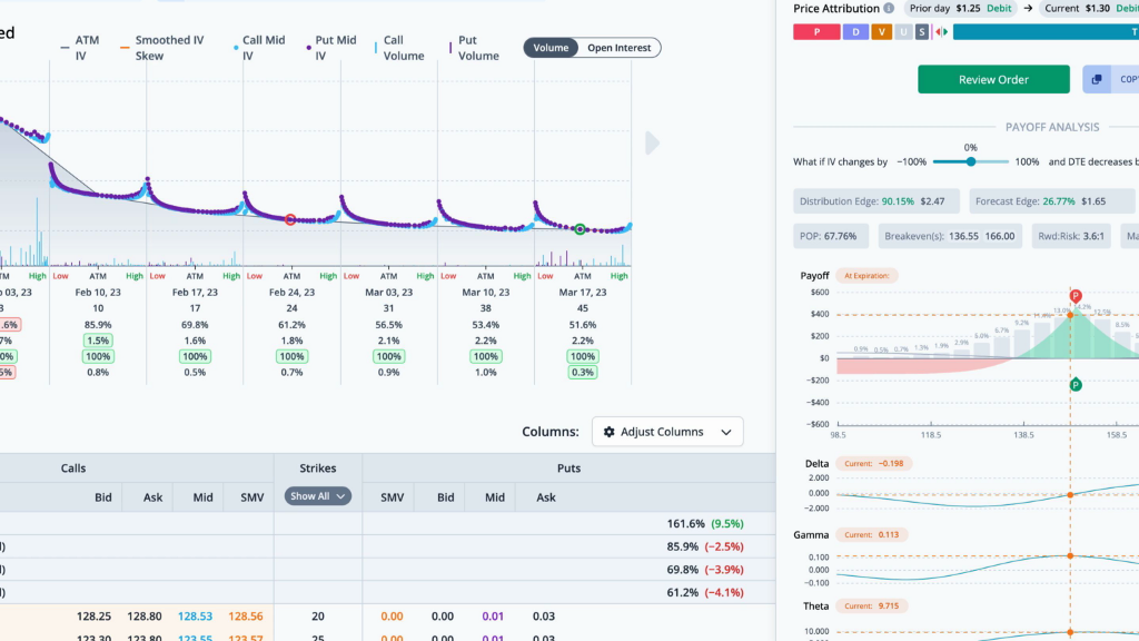 By pulling up the trade, we can see the theoretical values in more detail. The distribution edge, found by the expected value of the payoff picture on the stock’s historical distribution, has an edge of 90.2%. The forecast edge, which is derived from historical volatility, has an edge of 26.8%. Lastly, the smoothed edge, which is calculated by drawing a best fit curve through the monthly implied volatilities, has an edge of 0.0%. The edge is relative to the mid-market price of the trade. Greater positive edges are a theoretical benefit to the trader. We can also look at the payoff graph. The probability of profit sums the probability of the nodes for the part of the payoff picture above the zero profit line over three standard deviations. For this trade the probability of profit is 67.76%. The reward to risk divides the max gain by the max loss. Here the 3.6 to 1 is the ratio of the max gain of $469 to the max loss of $-130. There are two break evens for this LongPutCalendar at 136.55 and 166. You can also view the price attribution to see how much each of the individual greeks and theoretical values contribute to the change in trade price from yesterday to today.