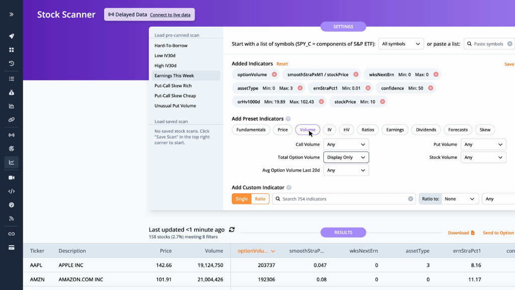 Let’s start by running a scan on stocks reporting earnings this week, which includes the total option volume indicator, sorted from greatest to least.