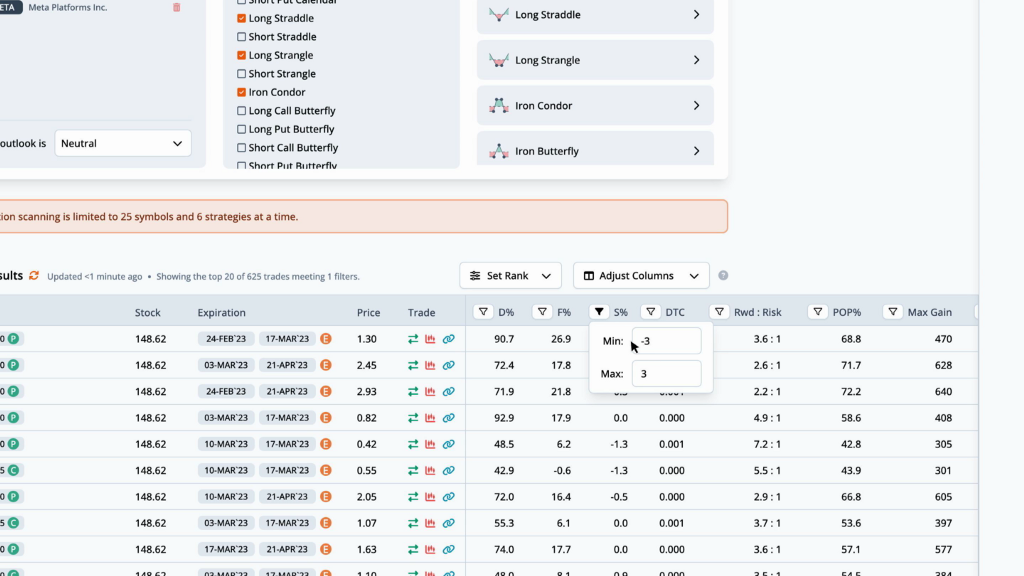 For META, the current PE ratio is 14.2, which is 41.3% under the average for the last twelve earnings observations. Returning to the overview tab, we can quickly run a scan to find the best option trades. Since earnings are right around the corner, we scan for neutral strategies, then filter the scan results by S%, or smoothed edge, by setting it between negative and positive 3%.