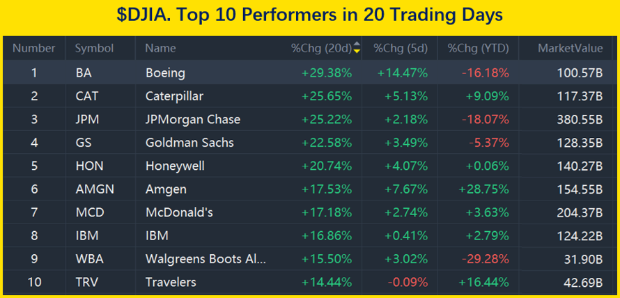 According to latest data from Tigertrade,, the top 10 performed stocks among the 30 constituent stocks in the past 20 days are: $Boeing(BA)$ ,$Caterpillar(CAT)$ ,$JPMorgan Chase(JPM)$ ,$Goldman Sachs(GS)$ ,$Honeywell(HON)$ ,$Amgen(AMGN)$ ,$McDonald's(MCD)$ ,$IBM(IBM)$ ,$Walgreens Boots Alliance(WBA)$ ,$Travelers(TRV)$.